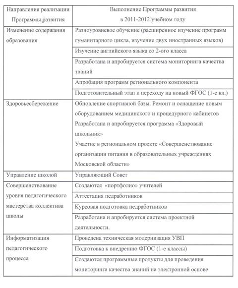 С 1 сентября 2011 года в школе вводится федеральный государственный стандарт начального общего образования (ФГОС) (Приказ Минобрнауки от 22.12.2009 г.) По новому стандарту начнут учиться 1-е классы. В школе будет организована внеурочная деятельность школьников по направлениям: -Спортивно-оздоровительное; -Художественно-эстетическое; -Научно-познавательное; -Духовно-нравственное; -Общественно-полезное. Для работы по новым ФГОС директор, заместитель директора по УВР в начальной школе, все учителя начальной школы прошли курсы повышения квалификации и готовы к работе по реализации новых стандартов. Разработана и утверждена "Основная образовательная программа начального общего образования" (Приказ №89/2 от 17 июня 2010г. " Об утверждении "Основной образовательной программы начального общего образования"). 4.04.2011г. прошло собрание родителей будущих первоклассников, которые были ознакомлены с Приказом Минобрнауки по введению ФГОС. 7. Финансовое обеспечение функционирования и развития общеобразовательного учреждения За 2011-2012уч.г. для материально-технического обеспечения учреждения было израсходовано: 8. Результаты образовательной деятельности Внеурочная деятельность организована по направлениям. Патриотическое, духовно – нравственное, правовое, эстетическое, спортивно – оздоровительное, экологическое, трудовое. Идея патриотизма имеет отражение в ряде мероприятий, включенных в план школы. Это уроки граждановедения, уроки мужества, МИТИНГИ памяти, но особую значимость в воспитании патриотизма и гражданственности играет школьный музей, который включает в себя работу экскурсоводов, поддерживает связь с городскими музеями, Советом ветеранов Мытищинского района. В этом учебном году ученицы 7а класса Бондарь Янина и Мирзоева Мария, победившие в номинации "За Родину!" районного конкурса "История одного музейного экспоната", посвященного 70-летию Битвы под Москвой. Также продолжилось сотрудничество с учителем истории, работавшим в МОУ СОШ №24, членом Совета ветеранов - Пономаревой А.В. Исторический лекторий (цикл бесед с использованием мультимедиа, просмотром фото и кинохроники, музыки военных лет) стал в нашей школе уже традиционным. Духовно-нравственное воспитание. Одной из основных задач воспитательной деятельности школы является повышение эффективности работы по духовно-нравственному воспитанию. Работа ведется достаточно давно и планомерно. Начиналось все в 1997г. с кружков "История религии" и "Москвоведение" в начальных классах. Затем в школе появился кружок "Основы Православной культуры" в пятых классах. Число детей, чьи родители выбирали новый предмет, постепенно росло. Это были уже пятые, шестые, седьмые классы. В 2002 году на региональном уровне вводится предмет "История Московской области". Тогда же в нашей школе в старших классах учащиеся занимались факультативом "Православная этика и психология семейной жизни". В 2007 году вводится предмет "Духовное краеведение Подмосковья". Сегодня предмет "Основы православной культуры" стал уже обязательным в Московской области. В настоящее время наша школа является опорной площадкой в районе по духовно-нравственному воспитанию, преподаванию предметов духовно-нравственного цикла. На базе школы проходят семинары для учителей района, обмен опытом по теме "Духовно-нравственное воспитание учащ